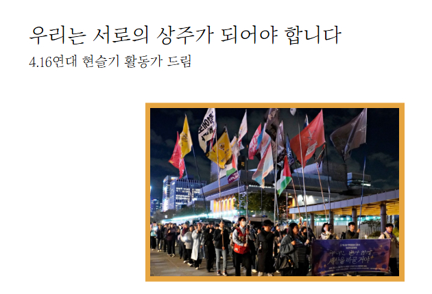 글이 훨씬 따뜻해졌어요ㅠ ㅠ 디자인도 디자인인데요 글이 416연대같아서 더 가까운 사이가 된 것만 같아요