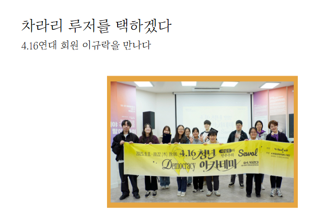 작년부터 4.16연대는 청년들과 함께 하는 아카데미와 책모임을 꾸준히 진행했습니다. 이때 만나게 된 귀한 인연 ✨이규락 회원님✨을 소개합니다. 규락 님은 청년아카데미 기획단이 되어주시기도 하고, 책모임 3기의 책을 추천해주시는 등 4.16연대 청년모임에 큰 역할을 해주고 계십니다. 묵묵히 사람들의 이야기를 경청하고 질문을 건네 주시는 규락 님의 이야기를 김우 운영위원님이 인터뷰로 담았습니다.